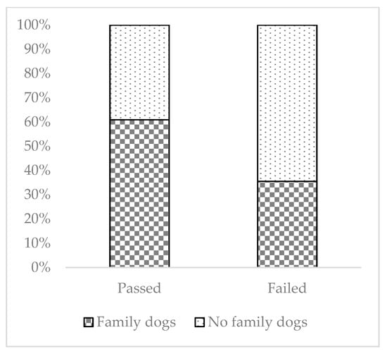 Family dog presence and pass rate. Passed dogs: with family dogs n = 42 (61%); without family dogs n = 27 (39%); Failed dogs: with family dogs n = 11 (35%); without family dogs n = 20 (65%).