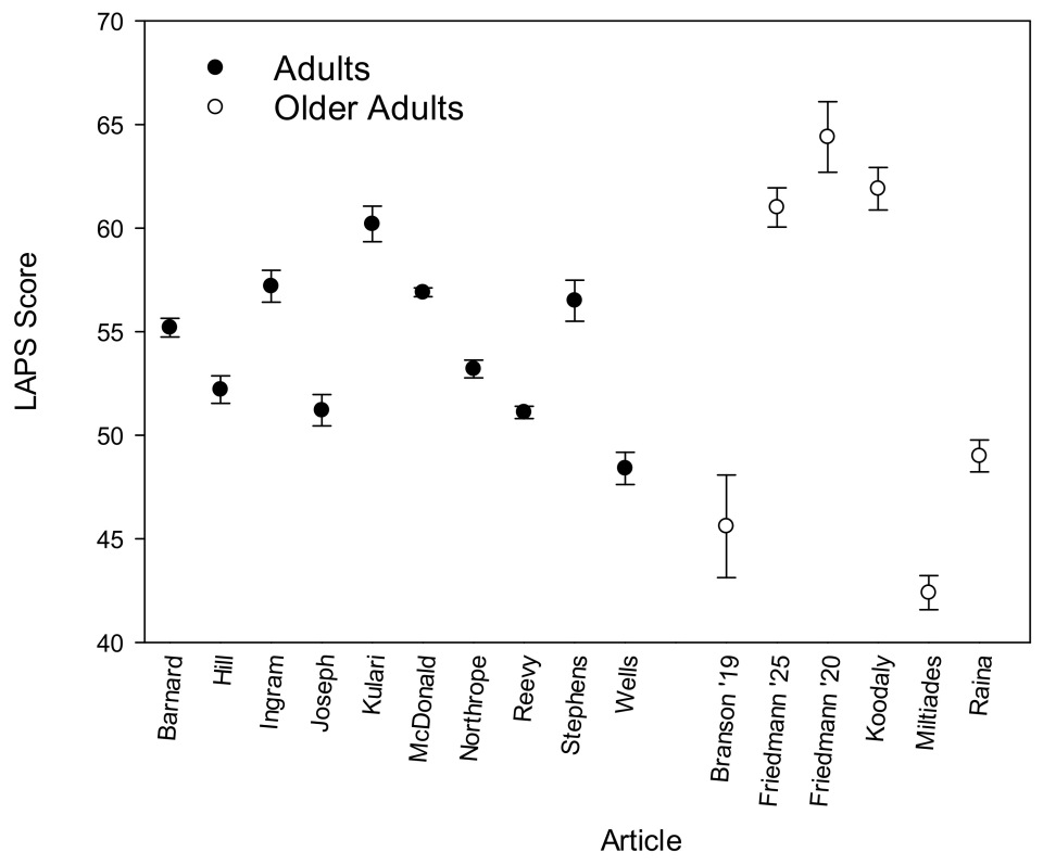 | [68] Friedmann, E., 2020 | C | PO | USA | OA | 3b | 90 | LAPS | = memory = cognition = executive function | CVLT WAIS Trails |