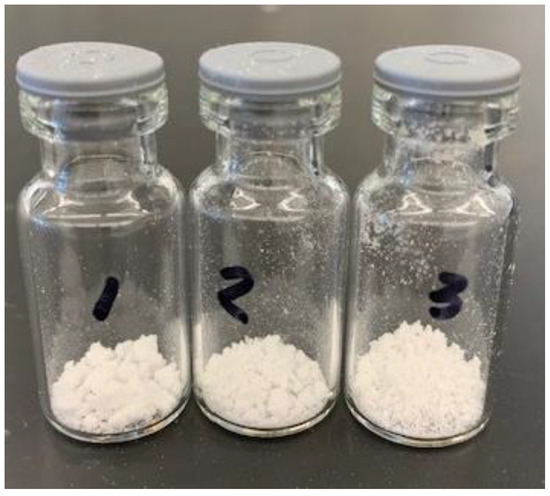 Once acetone was selected as the precipitation solvent, an initial set of precipitations was performed to assess the reproducibility of the process. Three identical precipitations were carried out into cold acetone (−20 °C) at a 100 mL scale, with agitation provided by magnetic stir bars at 300 rpm. A typical precipitated powder is shown in Figure 1. These three batches were pooled and staged under stability conditions at 5 °C ± 3 °C and 25 °C ± 2 °C with 60% relative humidity, and 40 °C ± 2 °C with 75% relative humidity for 3 months. The stability profile was compared to those of the liquid formulation (stability at 5 °C ± 3 °C and 25 °C ± 2 °C with 60% relative humidity) and lyophilization (same stability conditions).