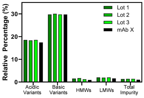 Charge variant analysis was performed using an Alliance HPLC (Waters Corporation, Milford, MA, USA) equipped with a dual absorbance detector set at 280 nm. The samples were diluted to 8 mg/mL with purified water and about 80 μg was loaded into a ProPac SCX-10 BioLC Analytical column (4 × 250 mm, Thermo Fisher Scientific, Waltham, MA, USA). The main, acidic, and basic peaks of the samples were separated and reported as a percent of the relative peak area.