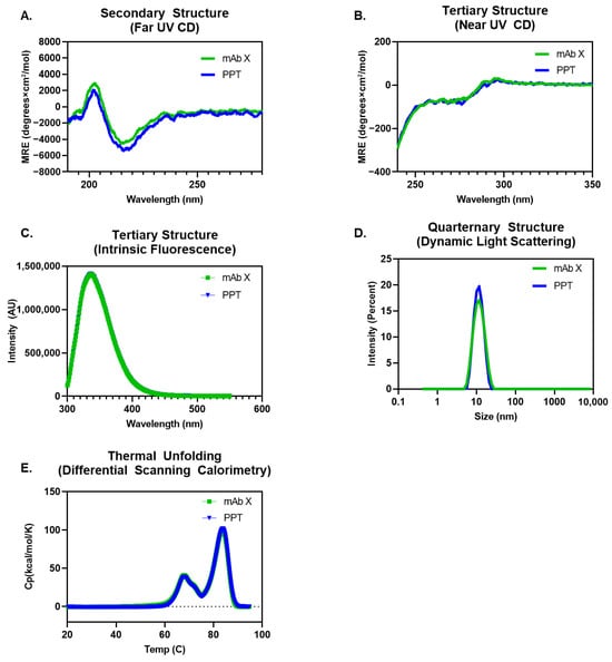 Comparison of secondary, tertiary, and higher-order structures of the reconstituted precipitated solid formulation (PPT) and mAb in solution (mAb X): (A) secondary structure via far UV CD; (B) tertiary structure via near UV CD; (C) tertiary structure via Intrinsic Tryptophan Fluorescence; and (D) higher-order structure via Dynamic Light Scattering. (E) The thermal stability of reconstituted precipitated solid formulation (PPT) and mAb in solution (mAb X) were determined using the DSC method. Changes in heat capacity (ΔCp) were plotted against different temperatures.
