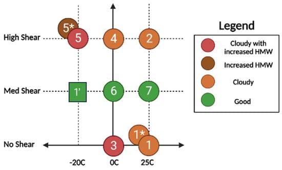 The impact of the precipitation parameters, i.e., temperature, mixing shear, and solvent/anti-solvent ratio on the quality attributes of the formulation was assessed using the experiments described in Table 1. Samples from each precipitation were analyzed and the high-level assessment is summarized in Figure 4. Samples 1, 1 *, 2, 3, 4, and 5 were cloudy upon reconstitution and needed to be filtered. Samples 2 and 4 were particularly cloudy and required 1 mL of extra water to be added for full dissolution. Samples 5 *, 6, and 7 were not cloudy and did not need to be filtered.