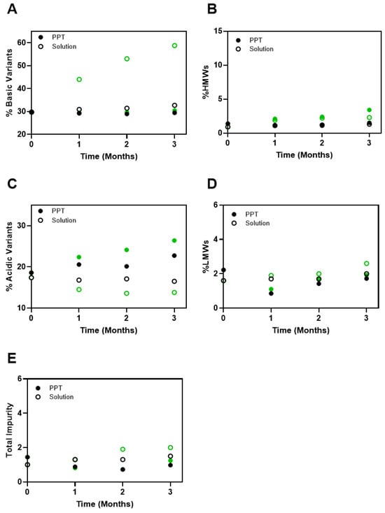 Comparison of % of basic variants (A), % of HMW species (B), % of acidic variants (C), % of LMW species (D), and % of total impurity (E) of precipitated mAb X (•) and mAb X in a solution formulation (◦) stored at 5 °C (black) and 25 °C (green) for 3 months.