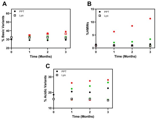 Comparison of % of basic variants (A), % of HMW species (B), and % of acidic variants (C) of precipitated mAb X (•) and mAb X in a lyophilized formulation (□) at 5 °C (black), 25 °C (green), and 40 °C (red) for 3 months.