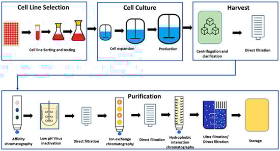 The process of the manufacturing of the mAbs can be divided into upstream and downstream unit operations. As part of the upstream operations, the cell lines are selected, grown, and scaled-up for the fermentation process []. Initially, frozen cells are thawed and cultured in flasks. Once the cell count reaches the desired level, they are transferred to the first stage bioreactor. As cells grow and multiply, they are subsequently transferred to the larger bioreactors until reaching the target cell concentration for the final transfer to the production bioreactor. The production bioreactor is the final and longest step of cell culturing, where cells are provided with nutrients to activate cellular pathways for product secretion. Upon achieving the target product titre, the cell culture process concludes, and the bioreactor content is harvested, and the downstream operations are subsequently initiated. During the harvest step, proteins are separated from the cellular components and the cell culture media by centrifugation followed by direct filtration. Once the proteins are separated, the material undergoes a series of purification steps to isolate and concentrate the biopharmaceutical product. Various techniques such as chromatography, filtration, and centrifugation may be employed to separate the target product from impurities and host cell proteins [,]. Figure 1 illustrates the overall general schematic for mAb manufacturing.