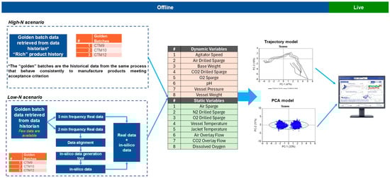 Workflow for the model development and monitoring workflow for low-N and high-N data scenarios. Based on the type of the variables (dynamic and static), PCA and trajectory models were developed and deployed as separate models in Aspen Process Pulse V12.2 (Aspen Technology, Inc., Bedford, MA, USA) for real-time monitoring.