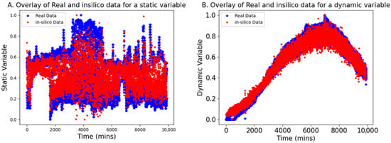 This section presents the results of using bGen to generate in silico datasets for low-N scenarios, applied to both static and dynamic variable examples. The bGen applies Gaussian process state-space models to build in silico datasets from the few historical batch datasets. In Figure 3, the red points represent the data points generated in silico, while the blue points display the real low-N data points. The two real batch data have a sampling frequency of 2 min, while in silico batches are generated with a sampling frequency of 50 min. The bounds for the in silico data were defined based on the bounds of the real data.