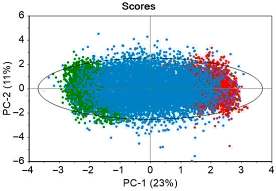 For both monitoring methodologies, the batches were organized in a variable-wise format merging low-frequency (5 min) real batch data and those generated in silico (50 min frequency) and imported to Unscrambler® V12.2 (Aspen Technology, Inc., Bedford, MA, USA) for further model development. The PCA model was developed using mean-centred static variables with a 95% confidence threshold and validated through cross-validation. Additional data refinement was performed by excluding outliers identified via F-residuals and Hotelling’s T2 limits to enhance model robustness and accuracy. This approach ensured that the model reliably captured relevant data patterns while maintaining stringent quality control measures.