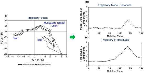 The batch trajectory model was built in Unscrambler® V12.2 (Aspen Technology, Inc., Bedford, MA, USA) employing the assumption-free approach for trajectory modelling, as outlined by Frank Westad et al. []. It begins by constructing a PCA model with dynamic data to create trajectories that represent batch behaviour in the principal components space over time. A grid-search method identifies common start and end points for these trajectories. An average trajectory is established, where model distances indicate point deviations and F-residuals control limits evaluate the fit of samples to the model correlation structure. This method efficiently manages varying batch run times and process stages without the need for time warping or specific sampling frequencies. The trajectory model was constructed using mean-centred dynamic variables with a 95% confidence threshold and its validity was confirmed through cross-validation.