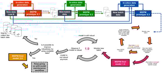 Figure 6 illustrates the lifecycle of the MSPM model for biopharmaceutical manufacturing in the low-N scenario, which begins with limited historical data and progresses toward the development of the final version. Prototype MSPM models are iteratively refined by expanding the volume of real data and generating new in silico data through retraining the GPSS model. This iterative process incorporates additional data from new batches, progressively enhancing the model’s data. Once a prototype demonstrates robust performance and meets predefined sensitivity criteria, it is designated as the final version. Additionally, as sufficient batches of real data become available, subsequent models can be developed solely using real data, thereby eliminating the reliance on in silico data generated by the GPSS model. Throughout the process, regular engagement with manufacturing subject matter experts is critical to identify false positive and false negative detections, with the aim of enhancing the model’s performance and validating its accuracy as part of the continuous improvement framework.