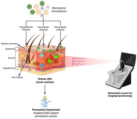 Figure 3. High-order imaging and spectroscopic methods for assessment of nanoformulation penetration and visualization of transport across skin layers. High-order imaging and spectroscopic approaches enable non-invasive, depth-resolved analysis of nanoformulations transport across multilayered skin. By providing spatial localization, penetration depth, and transport pathway information, these techniques complement conventional permeation experiments and improve the mechanistic understanding of transdermal delivery systems (Image created using BioRender icons from https://biorender.com and edited using Adobe Photoshop 2021 version 22.022.5.8 and Adobe Lightroom Classic version 10.1.2).