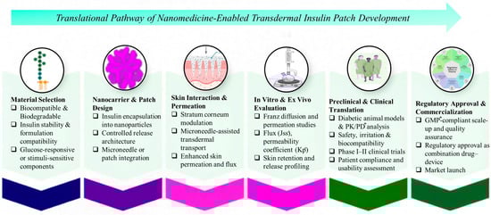 Figure 4. Diagram Illustrating the Translational Pathway of Nanomedicine-Enabled Transdermal Insulin Patch Development. The process progresses from rational material selection and nanocarrier–patch design to skin permeation strategies, in vitro and ex vivo evaluation, preclinical validation, clinical trials, and eventual regulatory approval and market translation. Each stage represents a critical decision point that influences the safety, efficacy, scalability, and clinical feasibility of transdermal insulin delivery systems. (Image created using BioRender icons from https://biorender.com and edited using Adobe Photoshop 2021 version 22.022.5.8 and Adobe Lightroom Classic version 10.1.2). * GMP: Good Manufacturing Practice; PK/PD: Pharmacokinetics/Pharmacodynamics; Jss: Steady-state flux; Kp: Permeability coefficient. Regulatory pathways and clinical requirements may vary depending on regional guidelines and regulatory agencies.