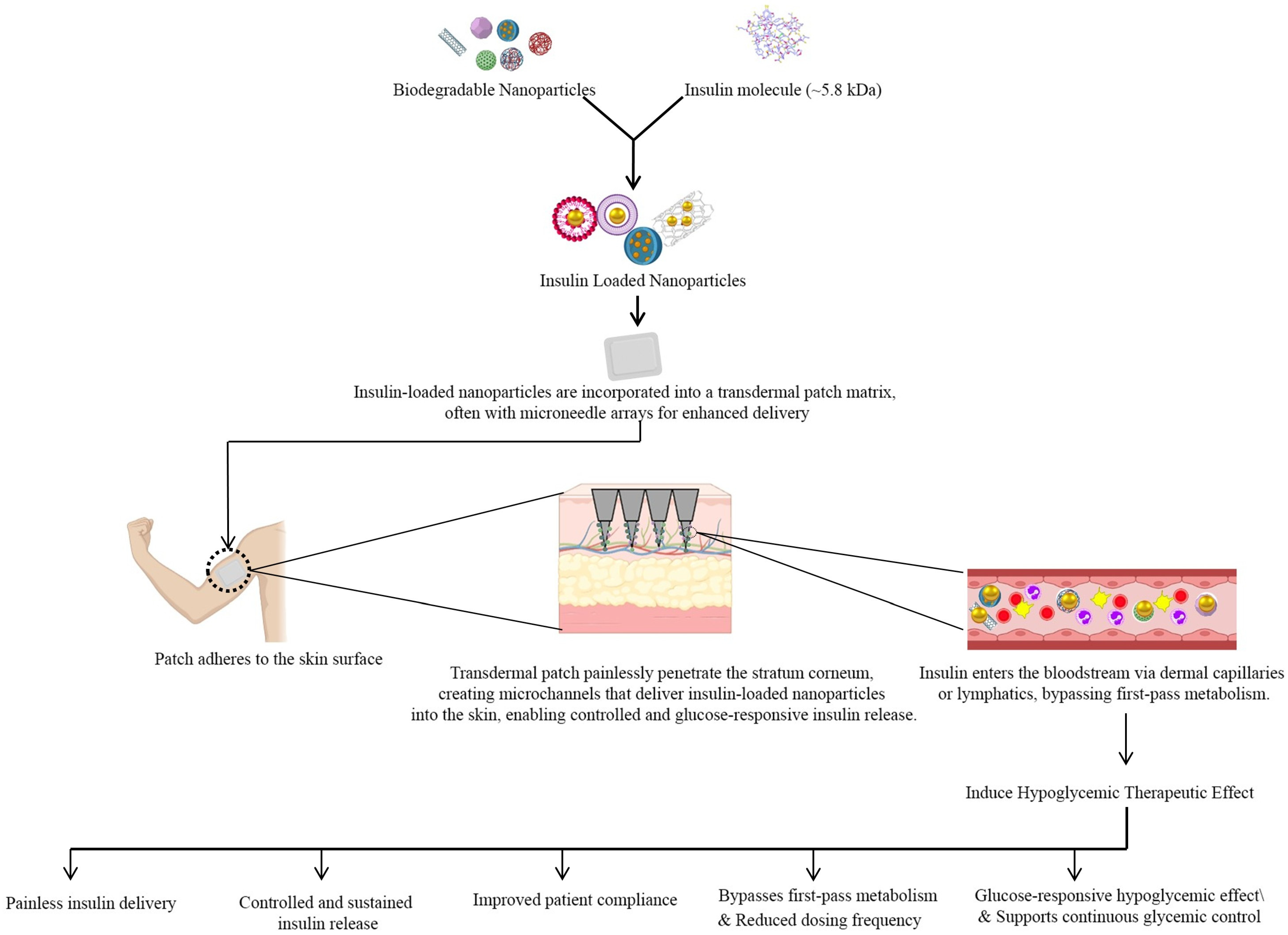 Insulin injection remains the best therapy for diabetes mellitus, but subcutaneous injection continues to pose challenges, including patient discomfort, poor compliance and fluctuating plasma glucose profiles. Recently, transdermal insulin delivery has emerged as a non-invasive strategy that bypasses gastrointestinal degradation and first-pass hepatic metabolism, thereby increasing insulin bioavailability and enhancing patient acceptance. Recent developments in nanomedicine have facilitated the development of transdermal patches with enhanced drug encapsulation, uptake and controlled release. Nanostructured lipid carriers, polymeric nanocomposites, liposomes and SLNs have demonstrated a five-fold enhancement of transdermal flux and an extended insulin effect in preclinical models. The addition of ionic liquids and polymeric nanogels leads to an additional increase in insulin aqueous solubility and permeation, resulting from the temporary regulation of stratum corneum lipid organization. Bright and stimuli-responsive patches with glucose oxidase or phenylboronic acid functional groups enable regulated insulin delivery in response to changes in blood glucose, demonstrating near-normoglycemia for up to 48 h in animal testing. Nanocomposite systems assisted by microneedles have also been advanced to the early clinical phase, offering enhanced reproducibility of their pharmacokinetics and a low risk of dermal irritation. Despite these encouraging results, several translational challenges remain, such as biocompatibility, repeatability in the production of nanocarriers, long-term stability of formulations and regulatory standardization. This review examines the physicochemical design principles, materials innovations and permeation mechanism of nanomedicine-engineered insulin patches, the current state of preclinical and clinical advancements, challenges in production and future perspectives in viable patient-focused transdermal insulin delivery.