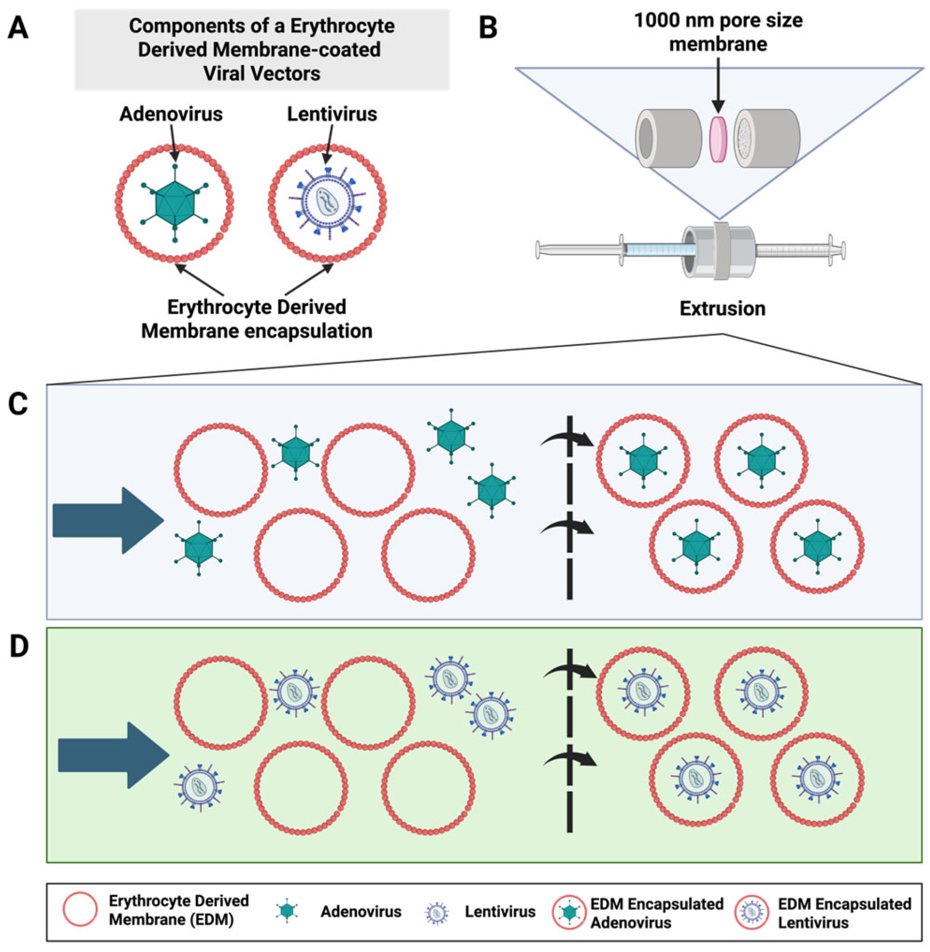 Schematic representation of erythrocyte-derived membrane (EDM)-encapsulated viral vectors and the extrusion process. (A) Illustration of EDM-encapsulated adenovirus and EDM-encapsulated lentivirus. (B) Schematic of the assembled membrane extrusion system, consisting of an inlet syringe, a membrane holder, and an outlet syringe. (C) Schematic of the extrusion process for adenovirus (Ad), in which Ad and EDM are loaded into the inlet syringe (left) and, following extrusion, emerge as EDM-encapsulated Ad (right). (D) Schematic of the extrusion process for lentivirus (LV), in which LV and EDM are loaded into the inlet syringe (left) and, following extrusion, emerge as EDM-encapsulated LV (right).
