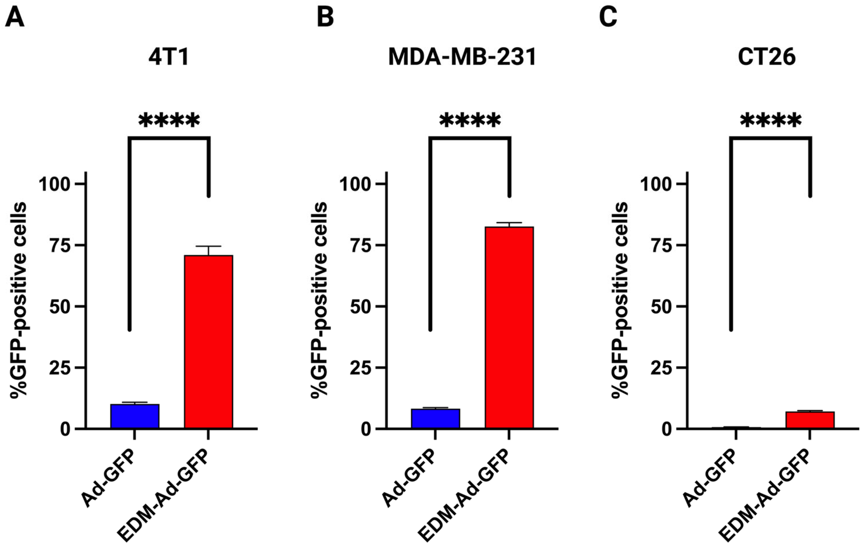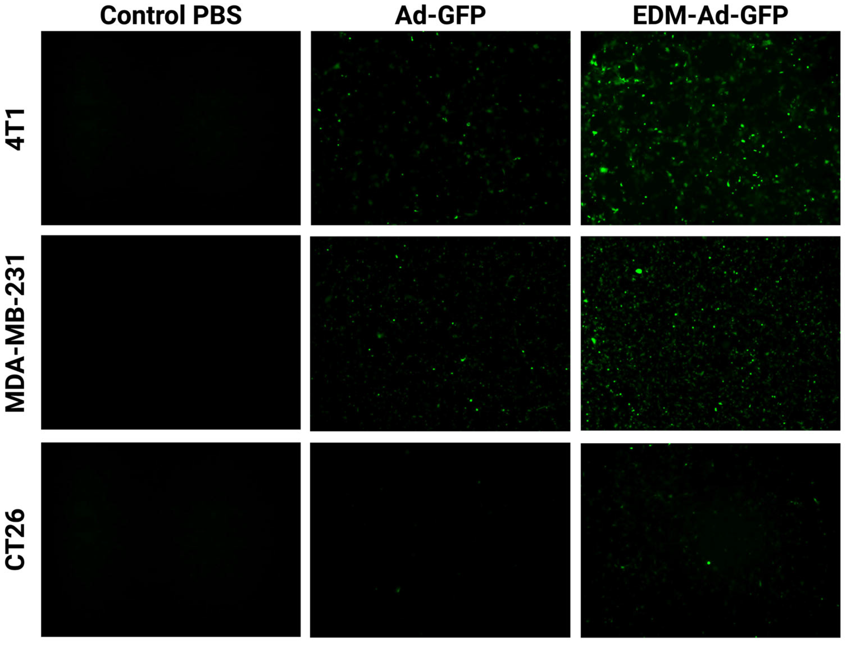 Comparative in vitro transduction of Ad-GFP and EDM-Ad-GFP was studied on 4T1 mouse breast cancer cells, MDA-MB-231 human breast cancer cells, and CT26 mouse colon cancer cells at MOI 50 (