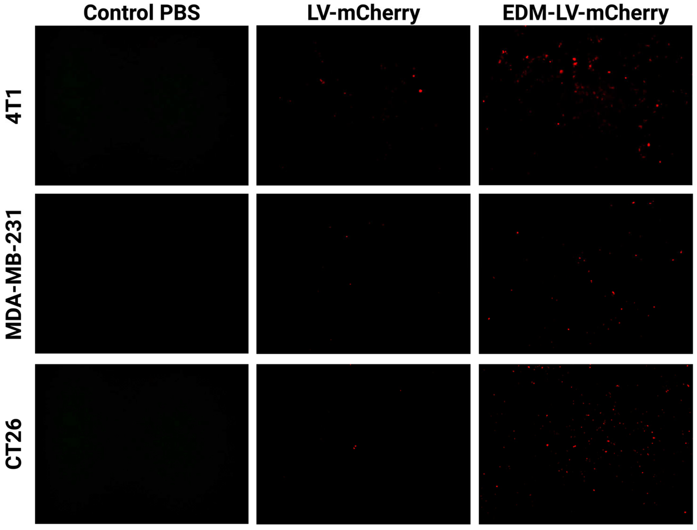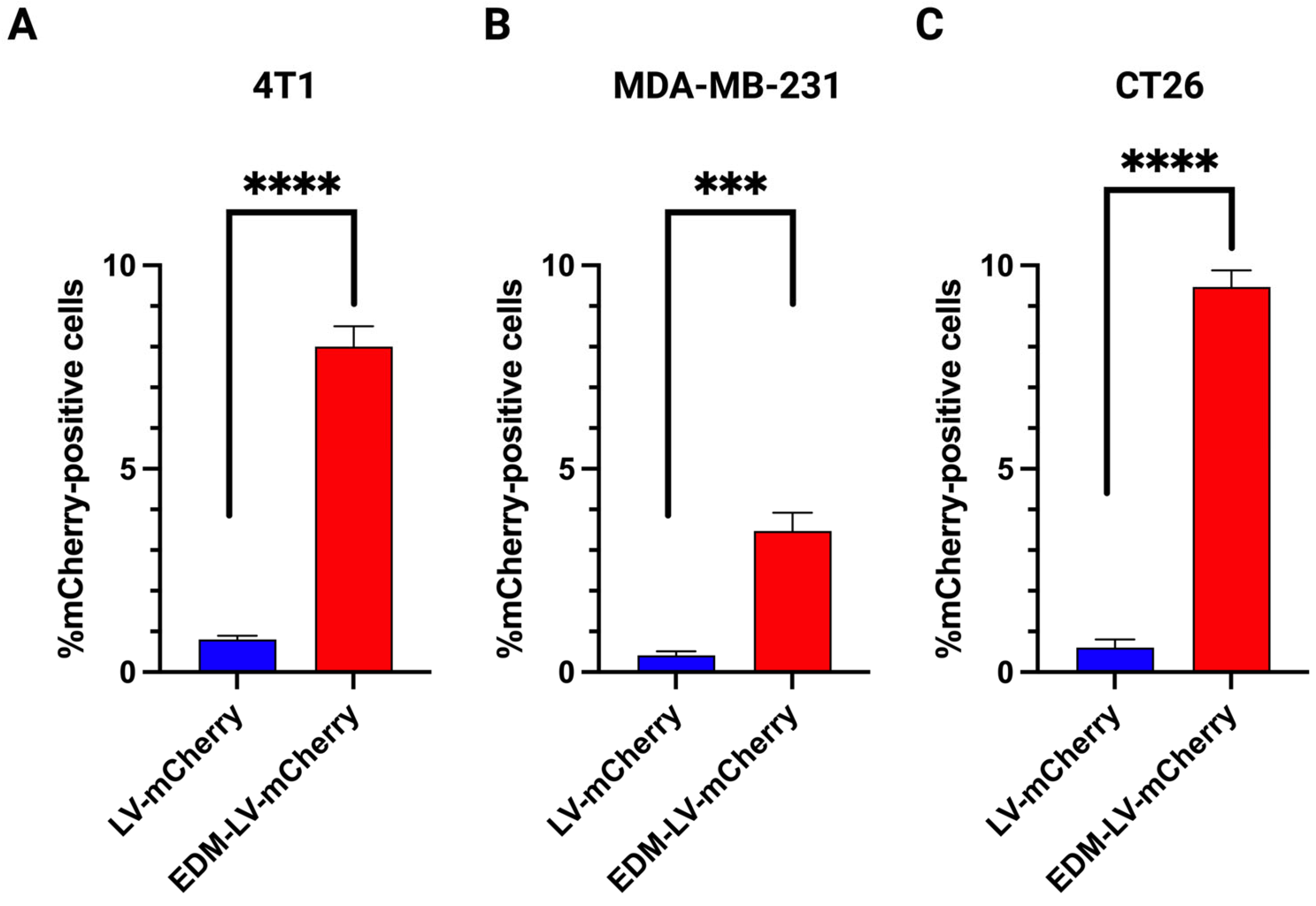 Comparative in vitro transduction of LV-mCherry and EDM-LV-mCherry was studied on 4T1 mouse breast cancer cells, MDA-MB-231 human breast cancer cells, and CT26 mouse colon cancer cells at MOI 1 (