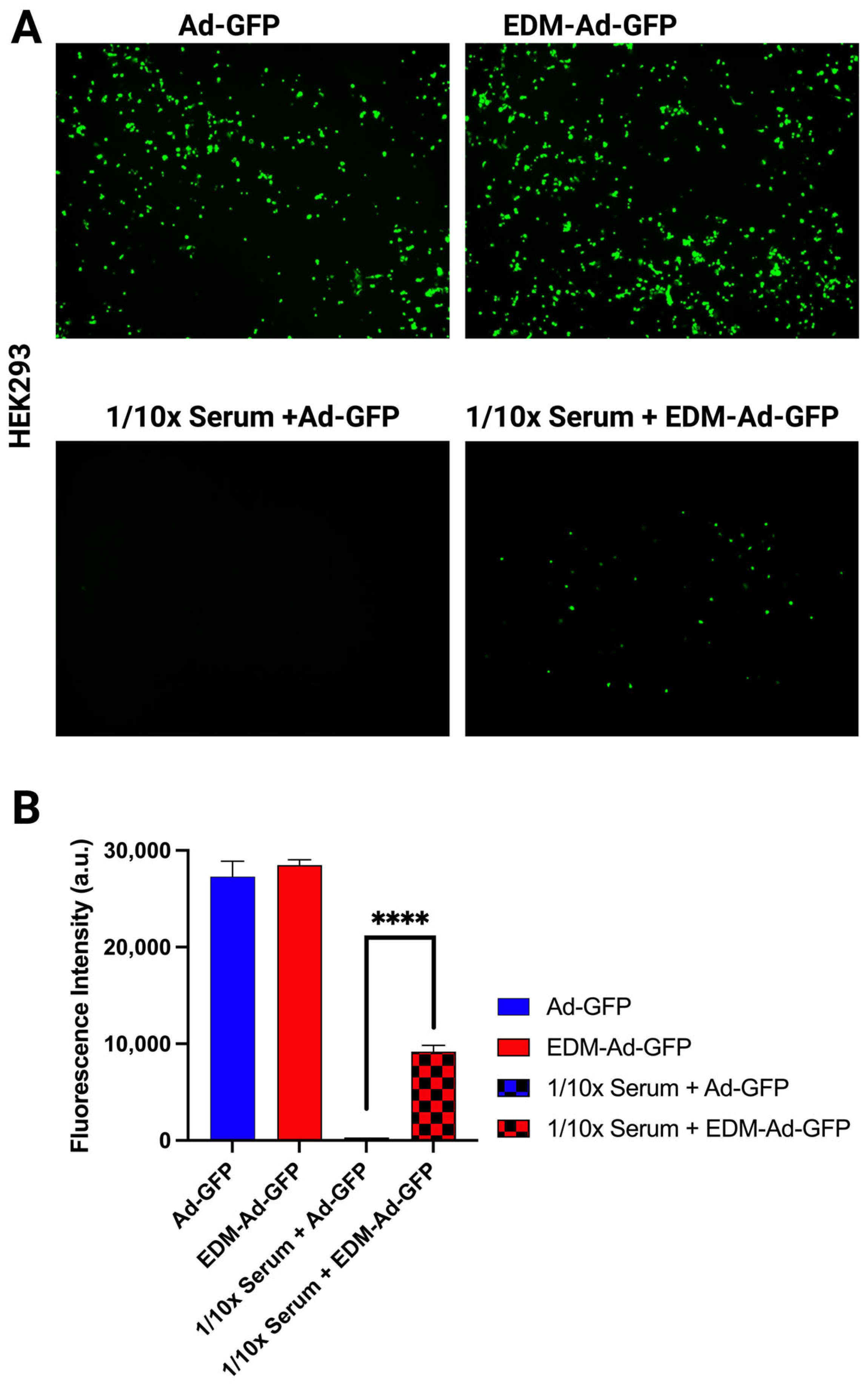 Effect of EDM encapsulation on in vitro protection from neutralizing antibodies. (A) Representative fluorescence microscopy images acquired at 40× magnification. (B) Comparative fluorescence intensity analysis shows that EDM-Ad-GFP achieved significantly higher transduction of HEK293 cells (****, p ≤ 0.0001) in the presence of 1:10 diluted neutralizing antibody serum.