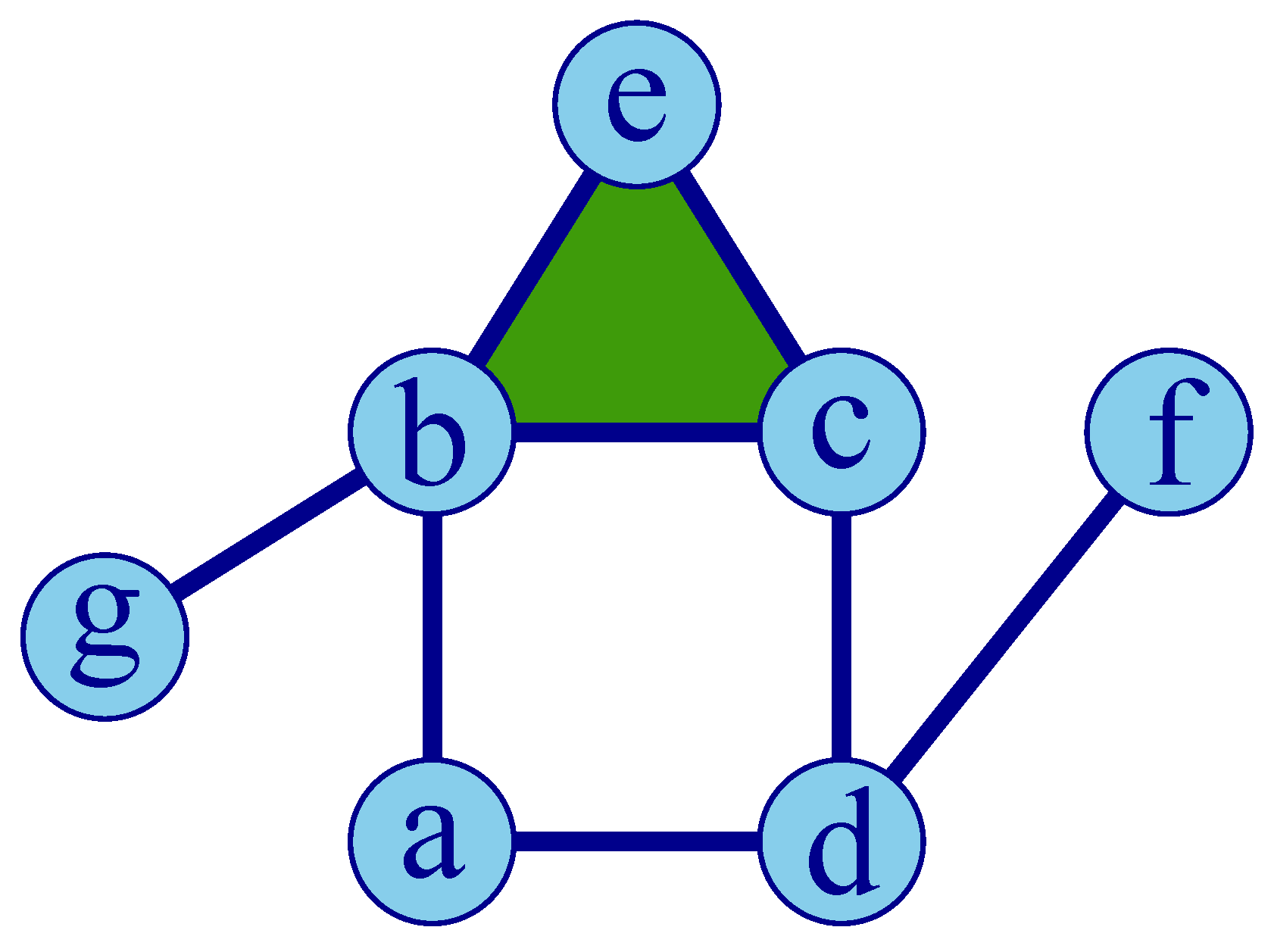 Consider a graph G = ( V , E ) with vertex set V = { a , b , c , d , e , f , g } and edge set E = { ( a , b ) , ( b , c ) , ( c , d ) , ( d , a ) , ( b , e ) , ( c , e ) , ( d , f ) , ( b , g ) } . This graph can be viewed as a 1-dimensional simplicial complex with seven vertices (0-simplices) and eight edges (1-simplices). We extend this complex by adding a 2-simplex, the triangle T = { b , c , e } , as shown in Figure 3. To analyze the topological structure of this complex, we define a filter function g : V N based on the degree of each vertex, such that g ( v ) = deg ( v ) , where deg ( v ) denotes the number of edges incident to vertex v. The degree values for each vertex are: