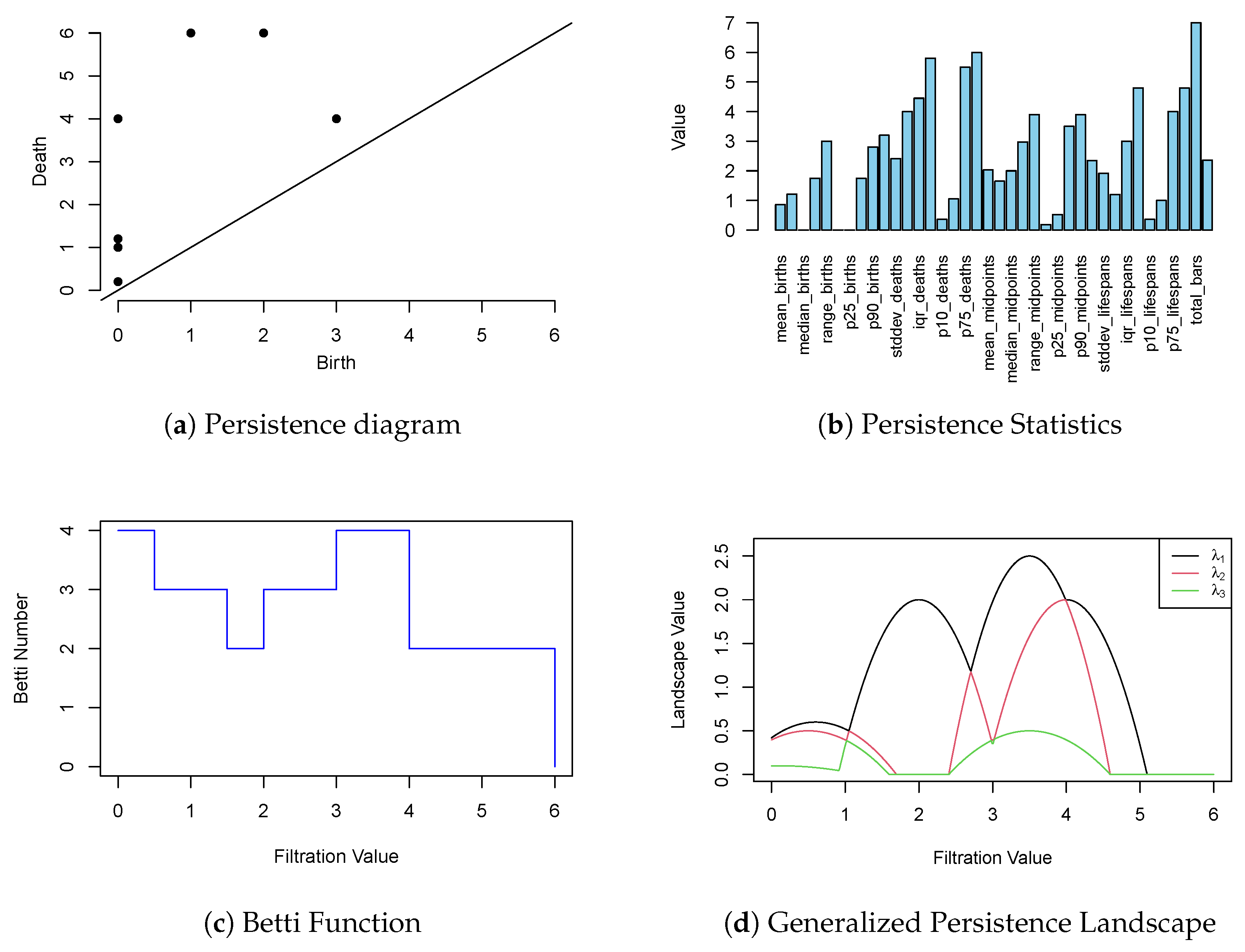 To compute the PD, we observe how topological features evolve as the filtration parameter t increases. At t = 1 , two connected components are born; one persists indefinitely, while the other dies at t = 3 when it merges with another component through the formation of an edge (a 1-simplex). At t = 2 , two more connected components are born; both of these die at t = 3 as they merge with existing components via edge formation. At t = 4 , four more edges and a triangle (2-simplex) are added, which results in the birth of a loop. Since this loop is never filled in by a triangle at any later stage in the filtration, it persists indefinitely and is assigned an infinite death time in the PD. The PD resulting from the lower-star filtration is visualized in Figure 5 and detailed numerically in Table 1. In practical applications, features with infinite death values—representing topological structures that never disappear—are handled differently depending on the problem at hand. They are often either excluded from the diagram or assigned a suitable finite constant to facilitate analysis and computation. However, in scenarios where the PD is used directly (e.g., with kernel methods or distance-based comparisons), it is often preferable to retain infinite death values, as they may carry meaningful topological information about essential or dominant features of the space.
