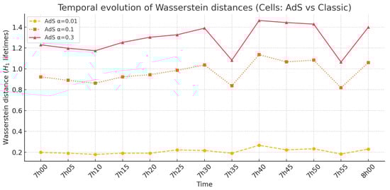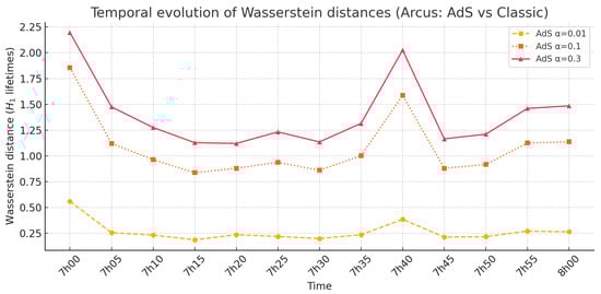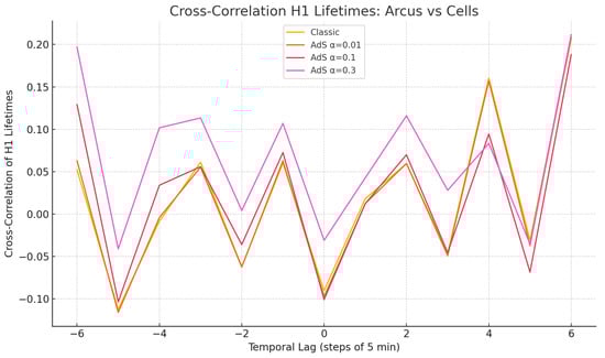 Figure 16 shows the results for Euclidean and AdS-based metrics. The curves display an oscillatory pattern with three salient features: (i) a global maximum at , (ii) a strong minimum at , and (iii) a secondary maximum at . The consistent peak at indicates that the arc topology at time t is optimally correlated with the cell topology observed five minutes later. This lagged alignment implies a predictive influence of the arc over the cellular structures. Conversely, the pronounced dip at highlights the absence of instantaneous correlation: the arc and the cells are not synchronized at the same radar frame, but rather exhibit a lead–lag relationship. The smaller maximum at suggests a partial retroactive effect, where cells at time t exert some delayed feedback on the arc at min. Such an alternating motif is characteristic of a time-asymmetric but reciprocal interaction.