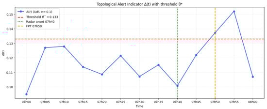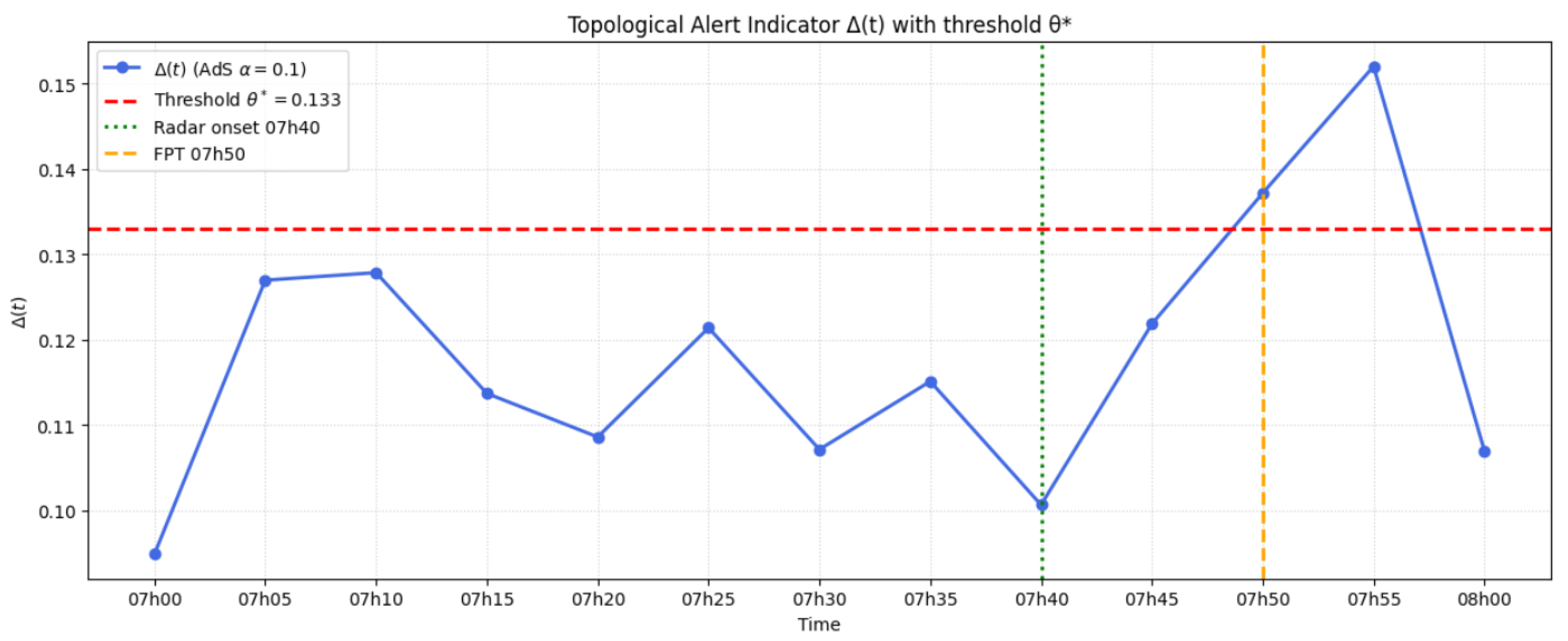 Topological Alert Indicator based on lifetimes (AdS ). The red dashed line indicates the threshold , the green dotted line the radar onset (07h40), and the orange dashed line the first-passage time FPT (07h50).