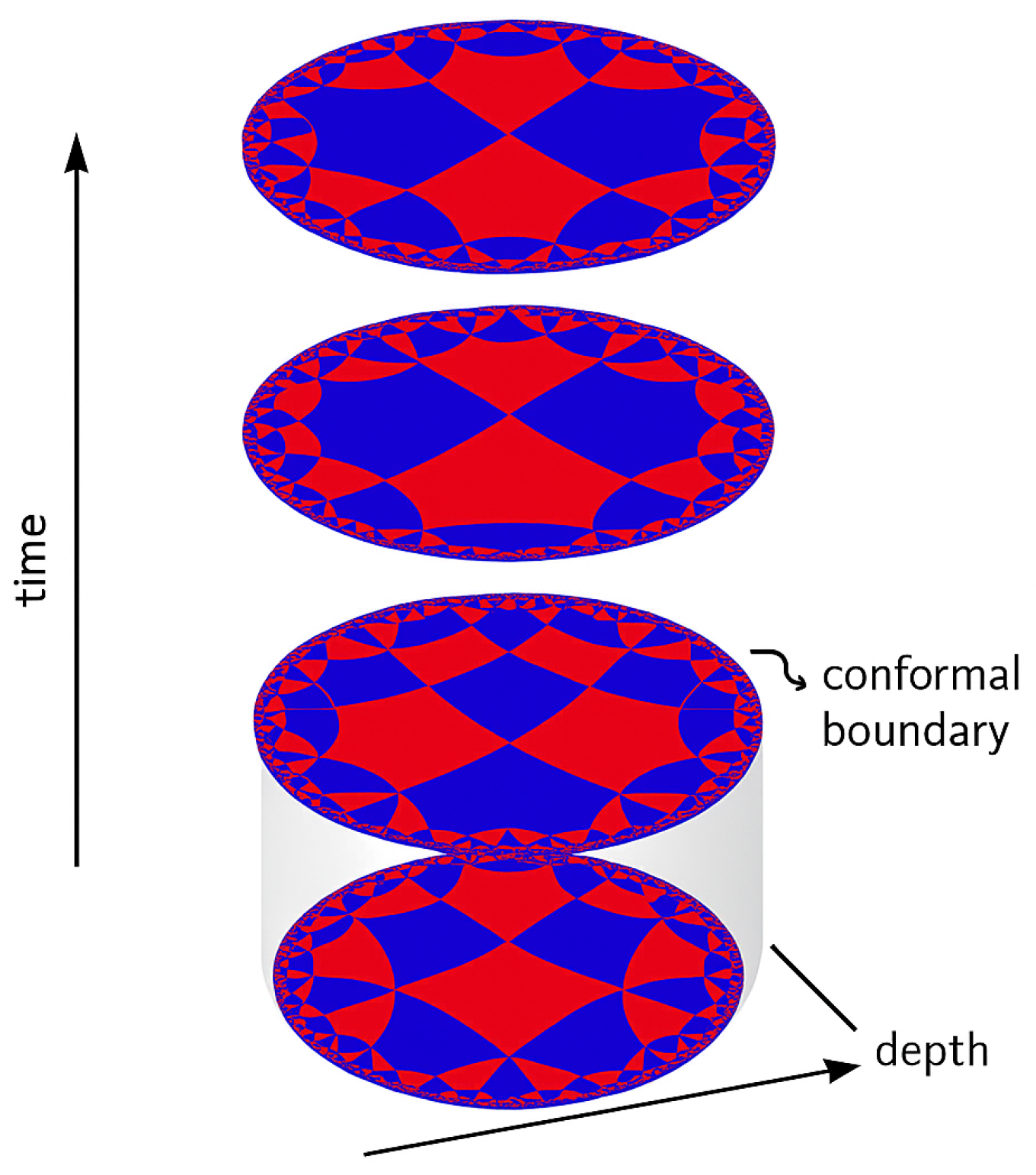 Anti-de Sitter space as stack of disks. The vertical arrow indicates increasing time; the diagonal arrow marks depth into the bulk (radial coordinate).