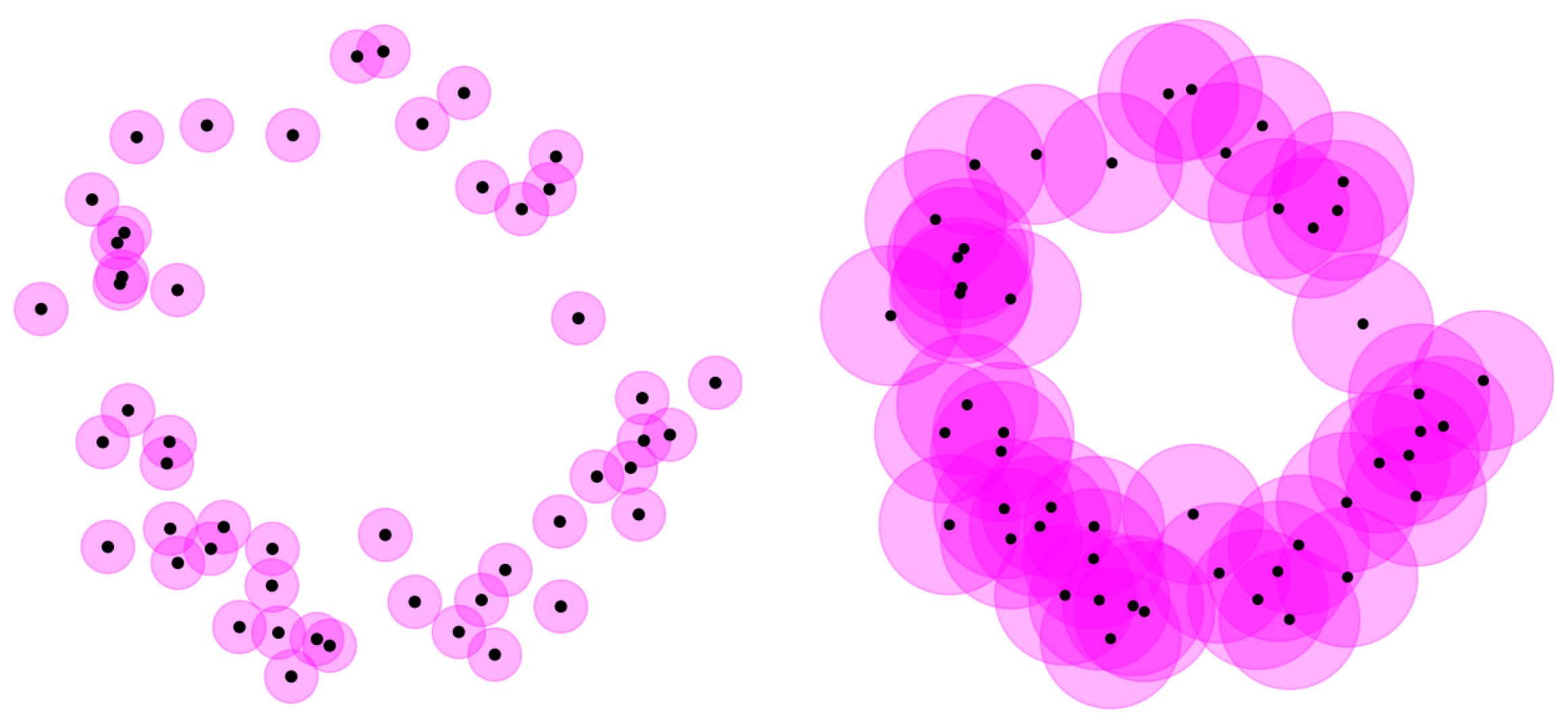 Thickening the point cloud X with -balls. (Left) small , disks (magenta) are mostly disjoint ⇒ many connected components. (Right) larger , disks overlap and the union forms an annulus, creating an loop. This construction yields the Vietoris–Rips filtration.