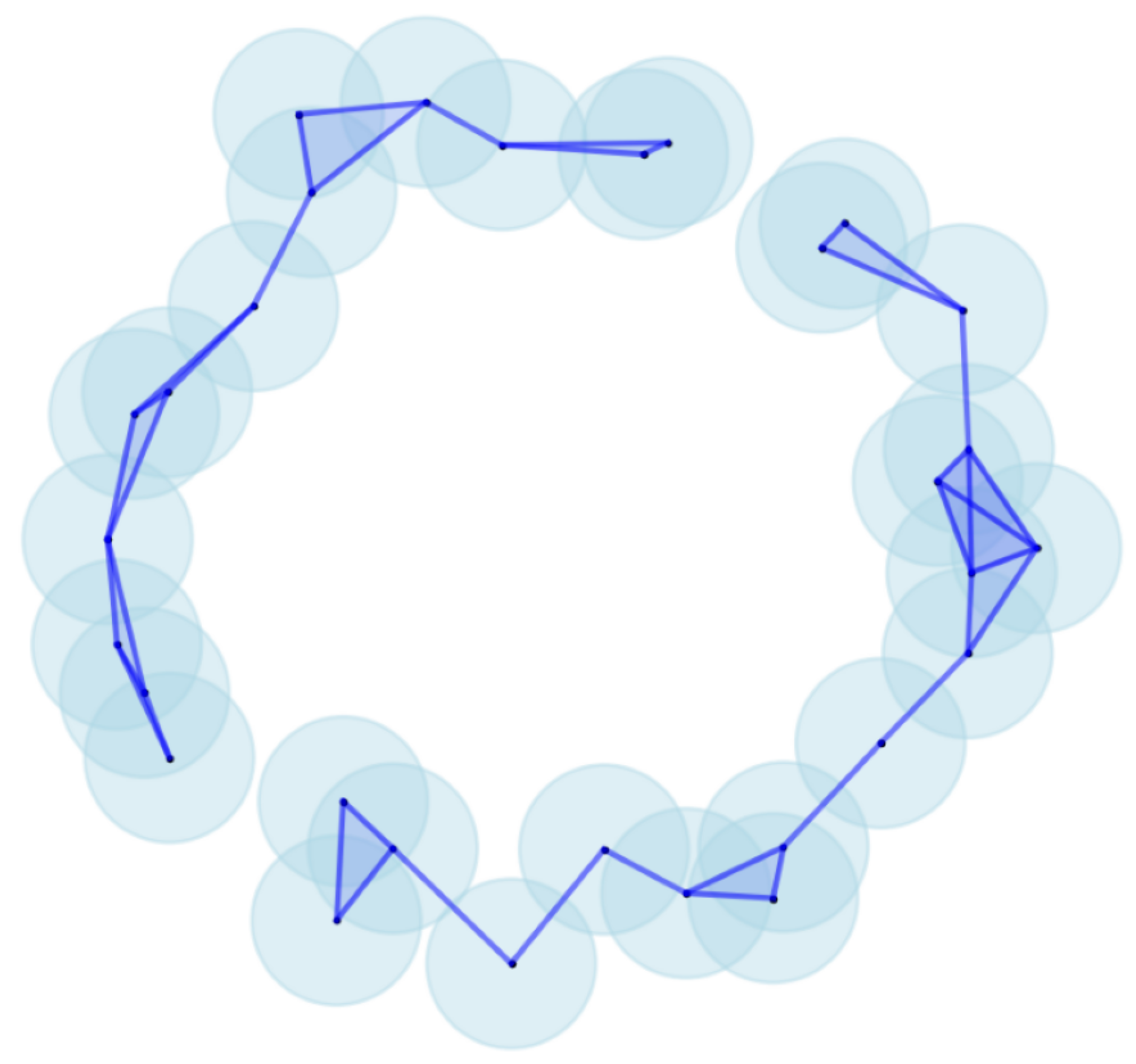 If two balls intersect, we add an edge between their centers; if three balls have a nonempty common intersection, we add the triangle spanned by their centers; see Figure 4. This is the nerve of the cover by balls. For each increasing value of , we thus obtain a simplicial complex and can compute homology at scale .