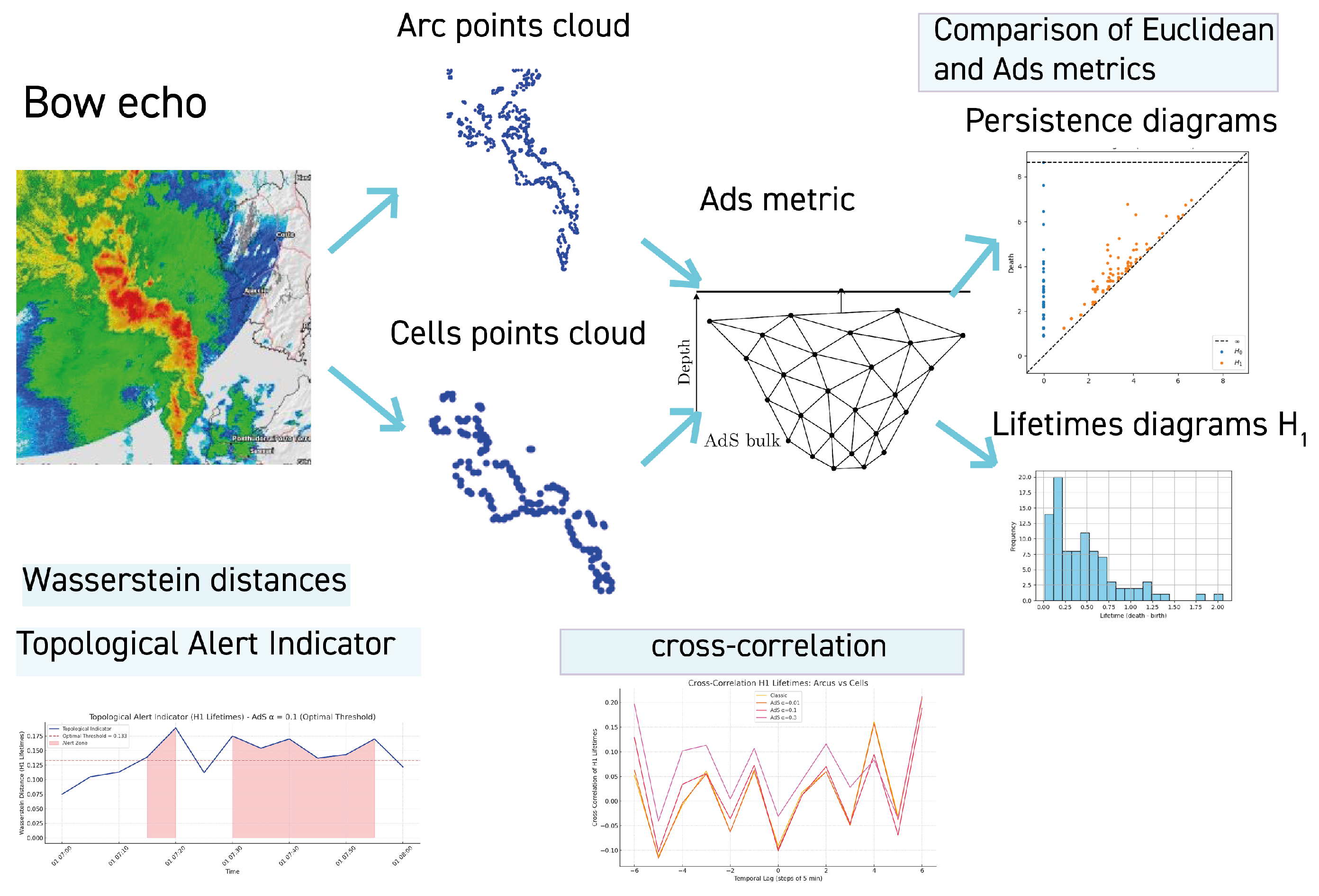 We propose a geometry topological framework to analyze storm dynamics by coupling persistent homology with Anti-de Sitter (AdS)-inspired metrics. On radar images of a bow echo event, we compare Euclidean distance with three compressive AdS metrics ( = 0.01, 0.1, 0.3) via time-resolved persistence diagrams for the arc and its internal cells. The moderate curvature setting () offers the best trade-off: it suppresses spurious cycles, preserves salient features, and stabilizes lifetime distributions. Consistently, the arc exhibits longer, more dispersed cycles (large-scale organizer), while cells show shorter, localized patterns (confined convection). Cross-correlations of lifetimes reveal a temporal asymmetry: arc activation precedes cell activation. A differential indicator based on Wasserstein distances quantifies this divergence and aligns with the visual onset in radar, suggesting early warning potential. Results are demonstrated on a rapid Corsica bow echo; broader validation remains future work.