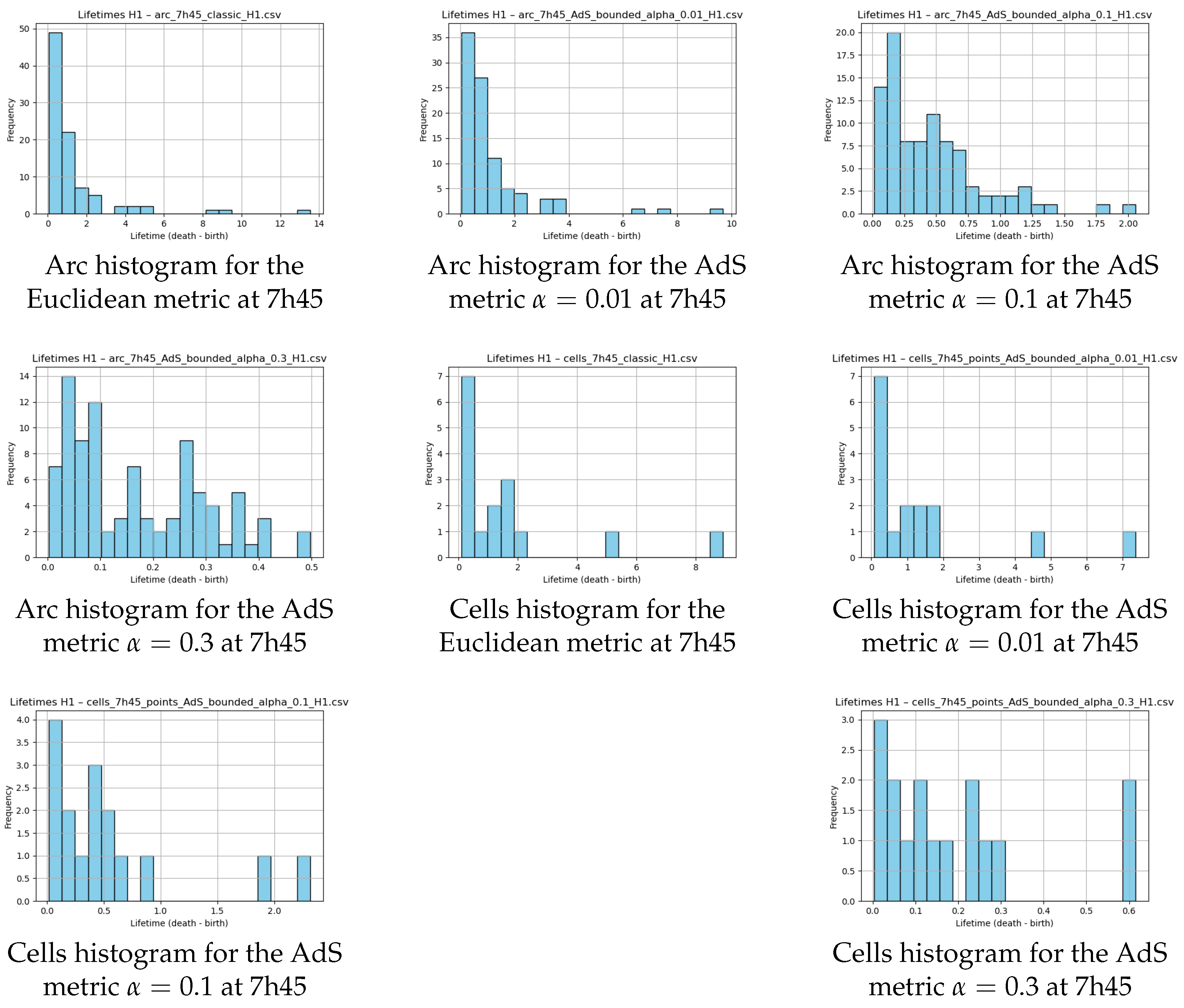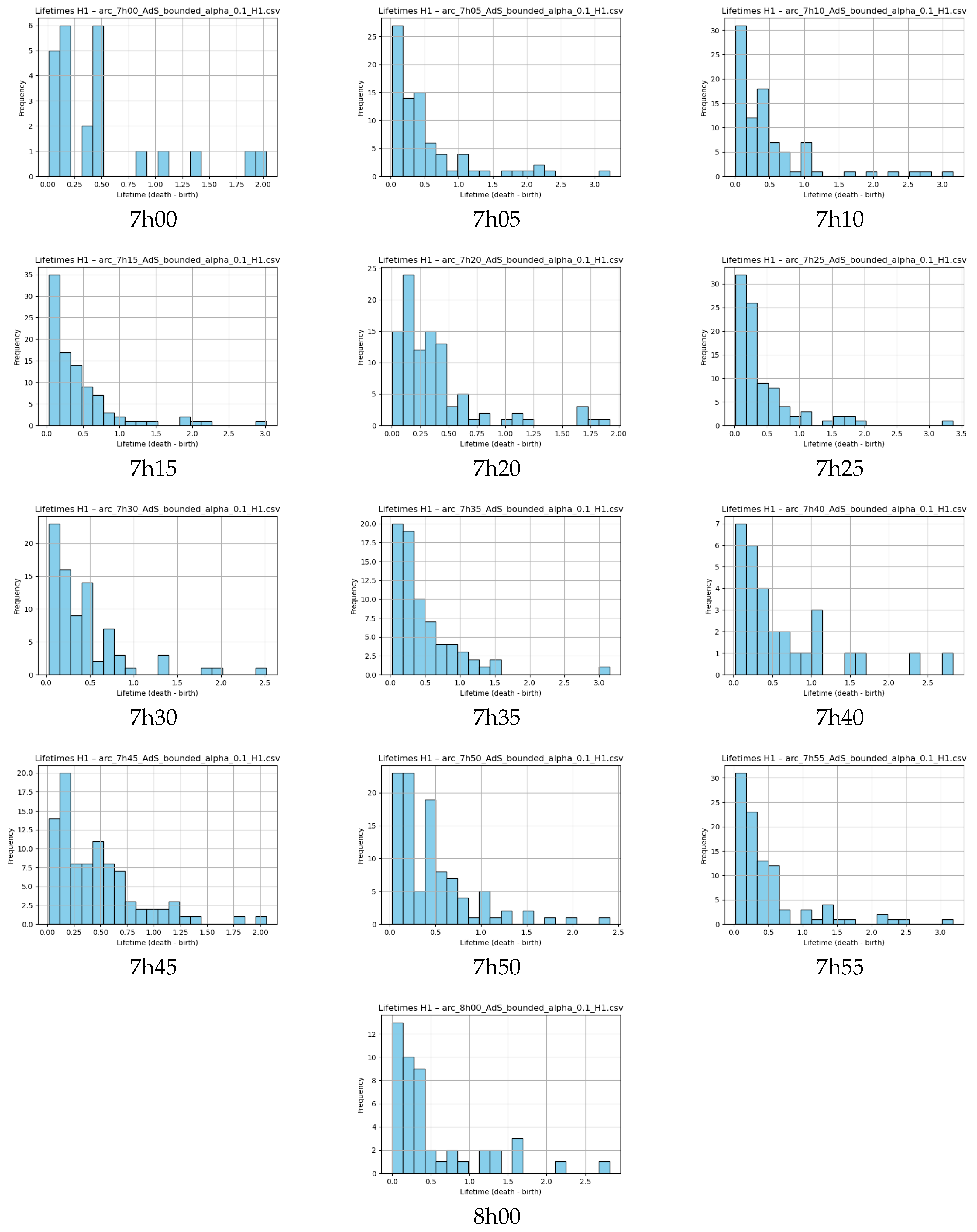 Histograms of lifetimes using AdS metric with , from 7h00 a.m. to 8h00 a.m for the arc.