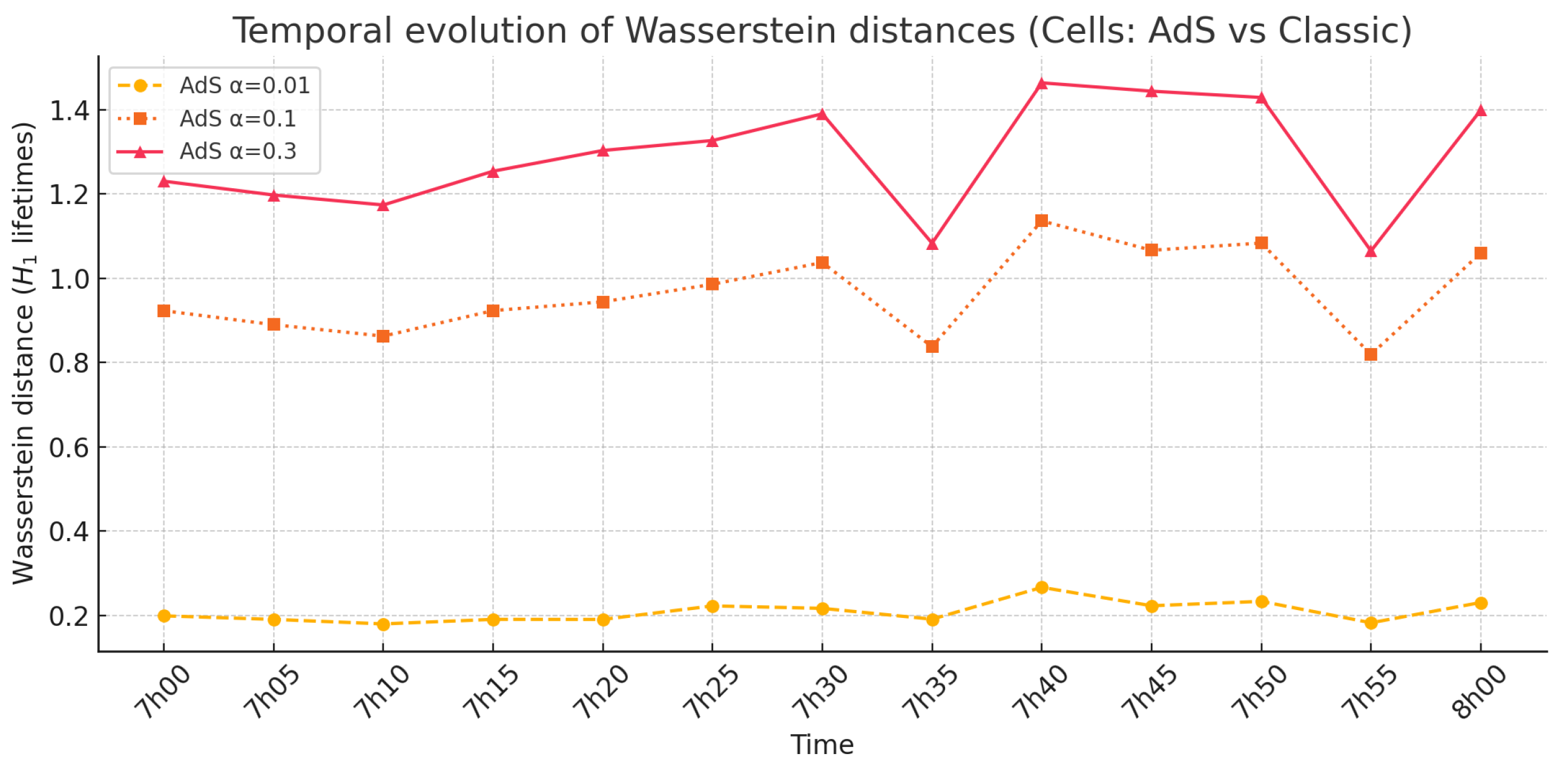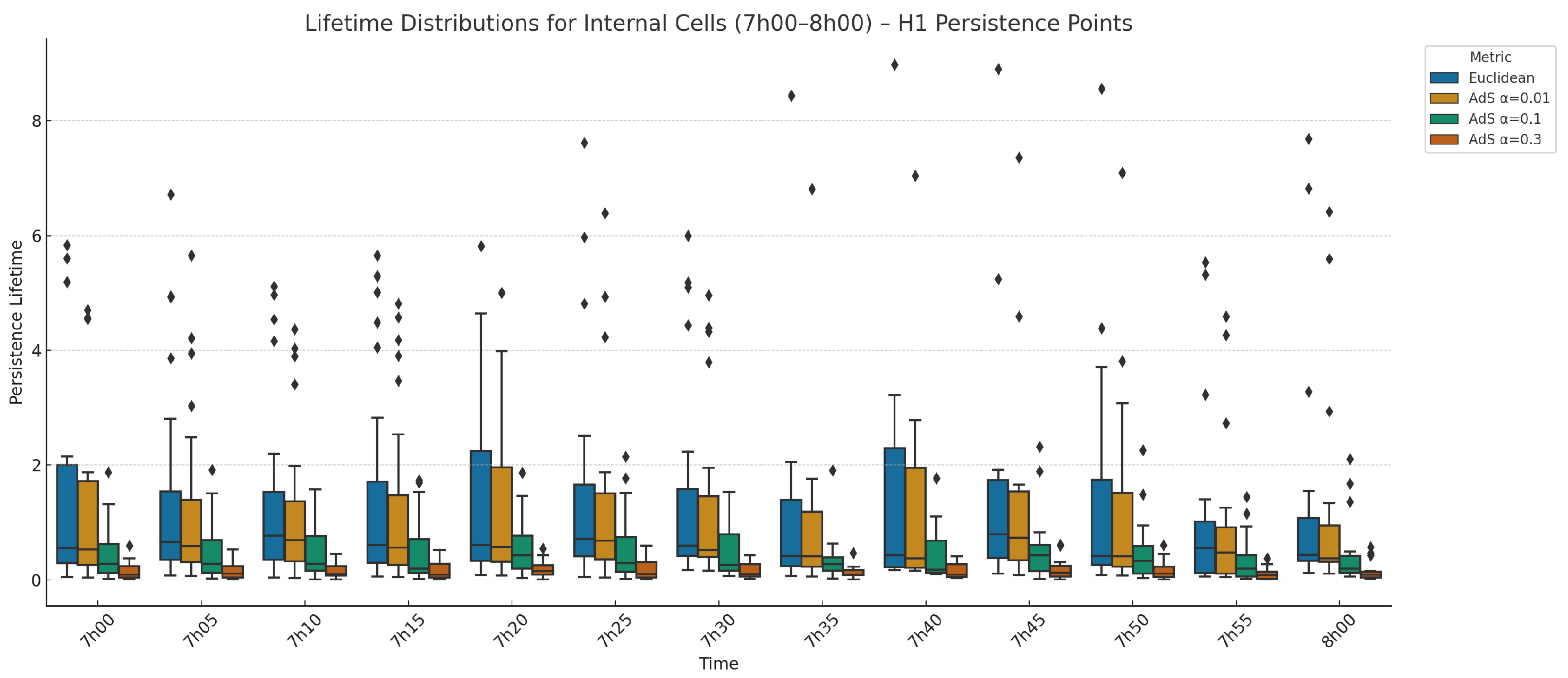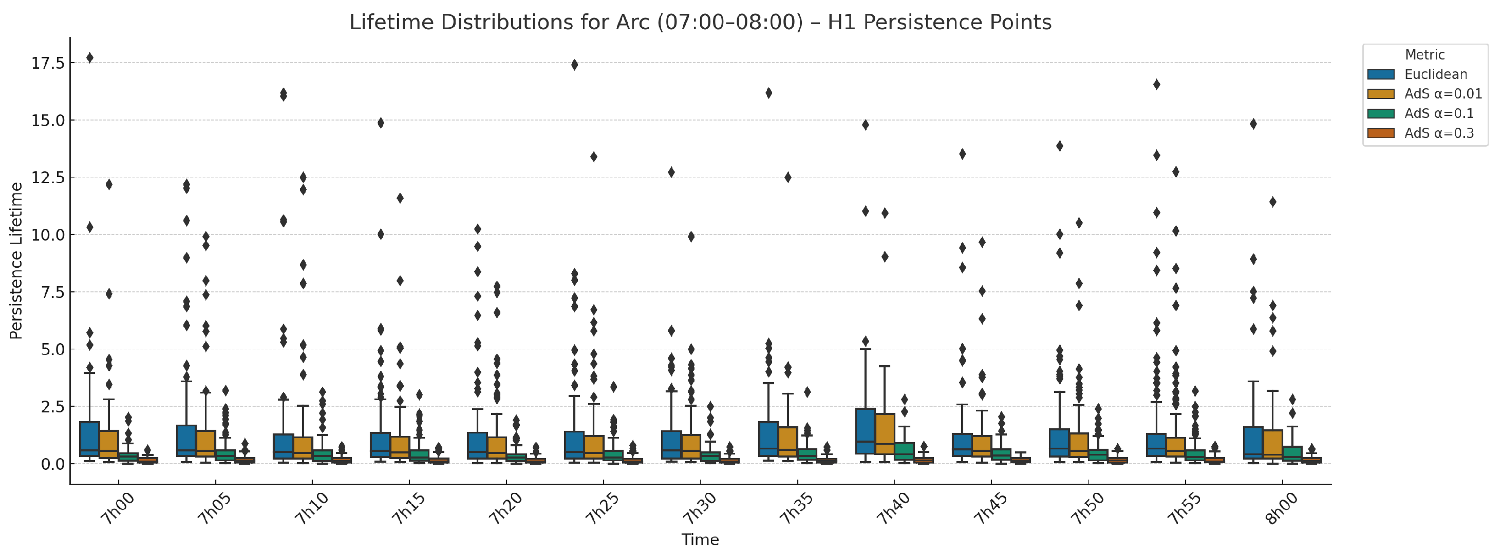 Applied to the Corsica bow echo (07h00–08h00), the analysis yields a consistent maximum at across all metrics. For example, the arc structure at 07h15 is best aligned with the cells observed at 07h20, confirming that the arc acts as a topological precursor with a predictive horizon of one timestep (5 min). This finding is robust to metric choice, but the amplitude of the correlation increases with the AdS compression parameter , indicating that curved metrics sharpen the causal signal by filtering spurious cycles and emphasizing structurally relevant features.