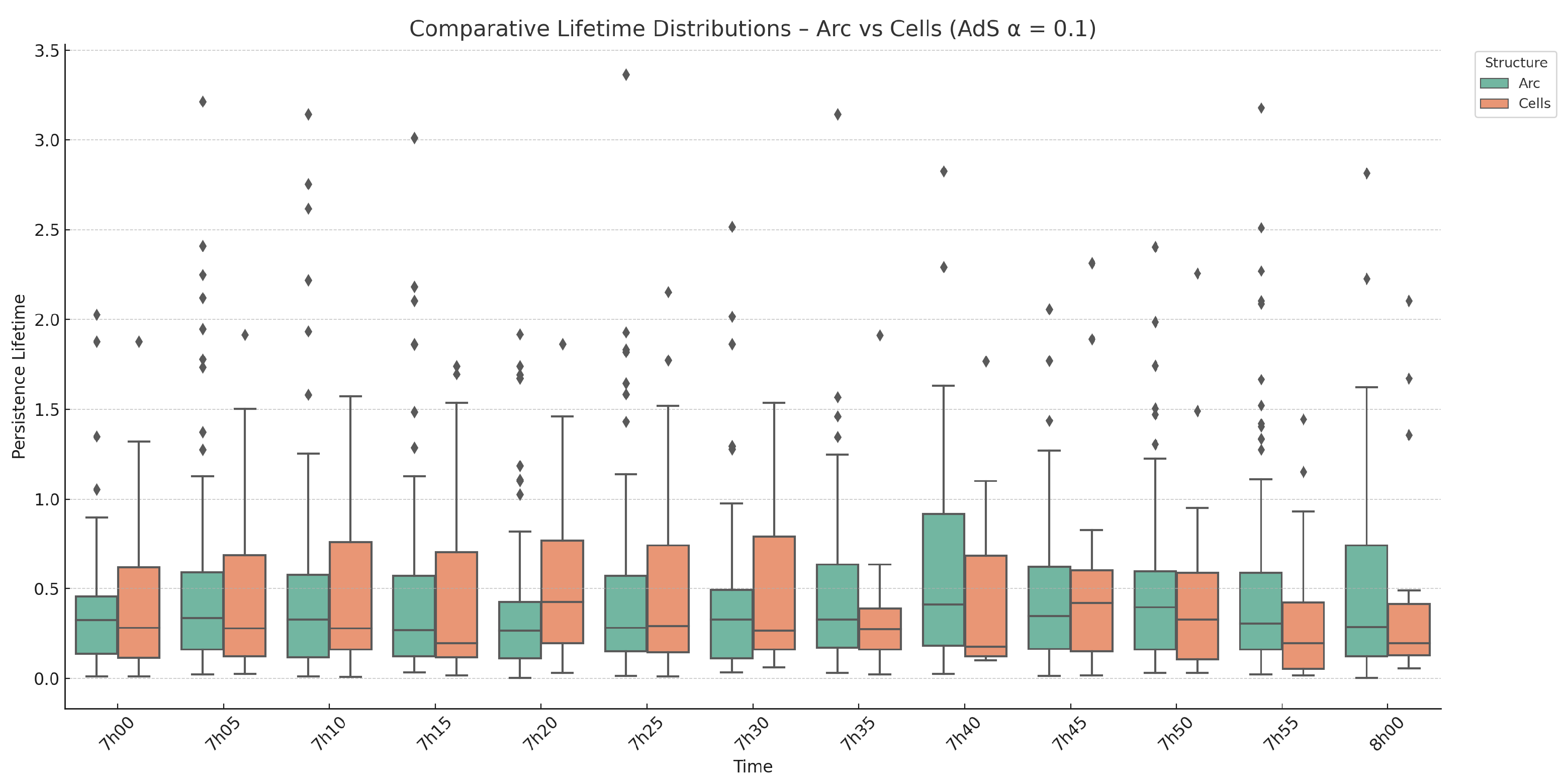 Scientific goals. This study investigates three interrelated questions: (i) How does the choice of distance metric affect persistence diagrams and the derived indicators? (ii) Can we detect the topological dominance of one structure over another, for example, the arc organizing or mimicking the cells? (iii) Does persistent topology provide evidence of temporal co-evolution or structural causality between the arc and the cells?