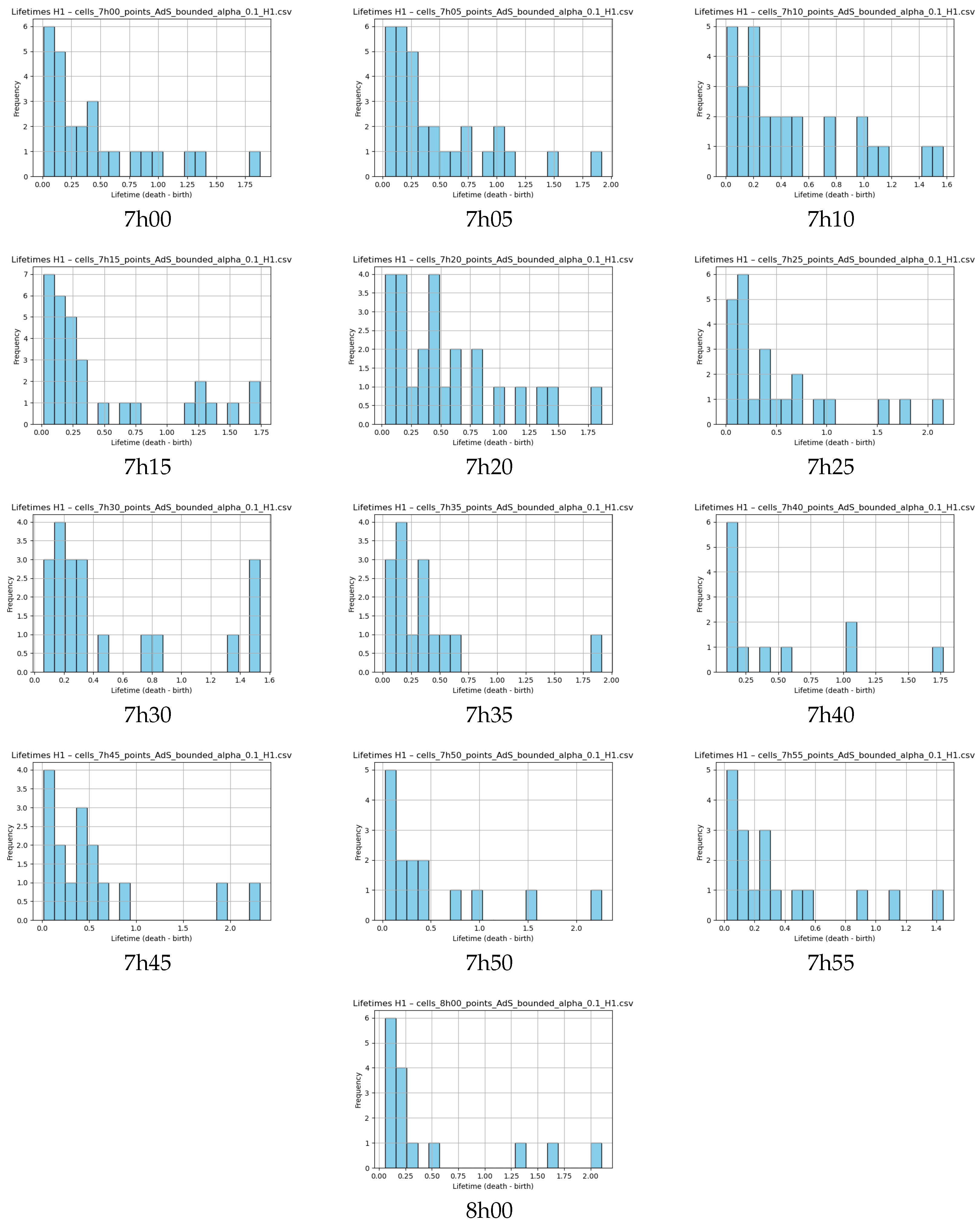 Histograms of lifetimes using AdS metric with , from 7h00 a.m. to 8h00 a.m. for the cells.