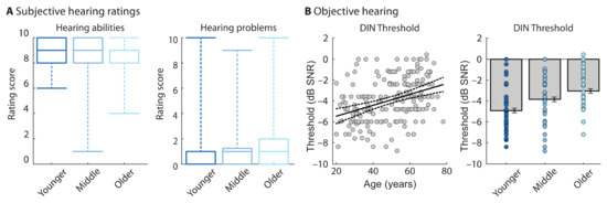 Age was positively correlated with subjective ratings of hearing problems (r = 0.19, p = 0.005) but was not significantly associated with self-rated general hearing abilities (r = −0.11, p = 0.096; Figure 2A). We further observed a positive correlation between age and digits-in-noise thresholds (r214 = 0.38 p = 6.05 × 10−9), with higher (i.e., worse) digits-in-noise thresholds for older participants (Figure 2B), as expected [16,59].