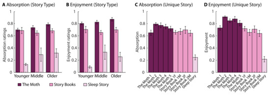 Story listening experience. (A,B) Absorption and enjoyment ratings by age group and story type. (C,D) Absorption and enjoyment ratings for each unique story.