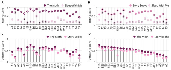 Additionally, stories are complex and can vary in their capacity to be engaging [37,38]. Prior studies have included a wide variety of story materials written and produced to facilitate different types of engagement and absorption across demographics. Specifically, episodes from the podcast series The Moth [39] have been used as examples of highly engaging materials [6,16]. The Moth podcast features spoken stories about human experiences and life events. Stories are intended to create “a unique, intimate, and often enlightening experience” for the listener [39]. Spoken versions of young adult fiction print books described as “high-interest, low-reading level” [40,41], using a simple vocabulary and linear plot lines, have been used as examples of moderately engaging stories [16].