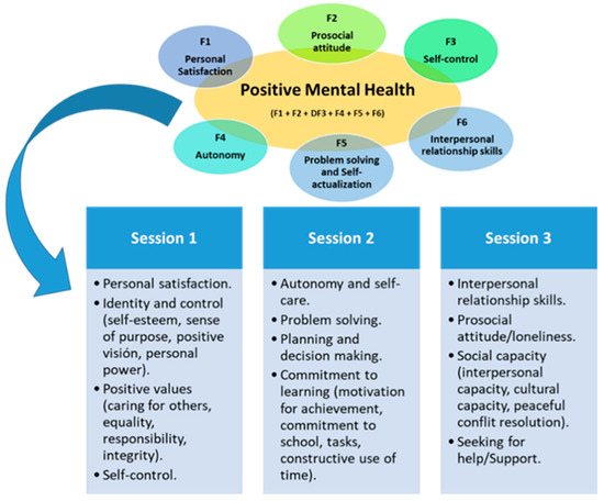 The design and planning of the content of the different sessions is developed by specialist mental health nurses working with children and adolescents and delivered by nurses trained in the application of the different sessions. Figure 3 shows the organization of the considered PMH factors, their sequence and the protective determinants of mental health.