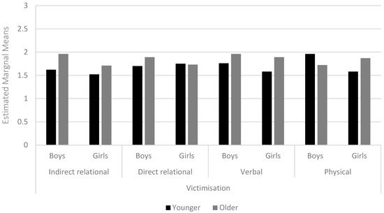 For victimisation experiences, there were similar patterns across gender and age group for each subtype of victimisation, with the exception of physical, where boys’ self-reports were higher for the younger age group (p < 0.005) (see Figure 2).