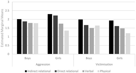 Aggression subtype × gender; victimisation subtype × gender (teacher-reports). Note: Contrasts showed significant differences between all aggressive subtypes except direct and indirect relational (all p < 0.01); significant differences between relational victimisation and physical victimisation (p < 0.05); significant differences between verbal and physical victimisation (p < 0.001).