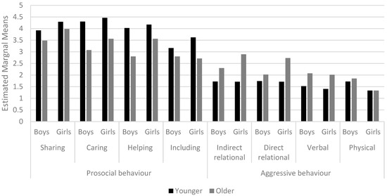 For prosocial behaviour, all subtypes were higher in the younger age group than the older age group, but this difference was greater for boys than girls (with the exception of including). Teacher-reports of aggressive behaviour were higher in the older age group but the differences between boys and girls were higher for relational than for non-relational aggression (where reports were higher in girls). This result should be treated with caution due to a small effect size. A breakdown of results can be seen in Figure 4.