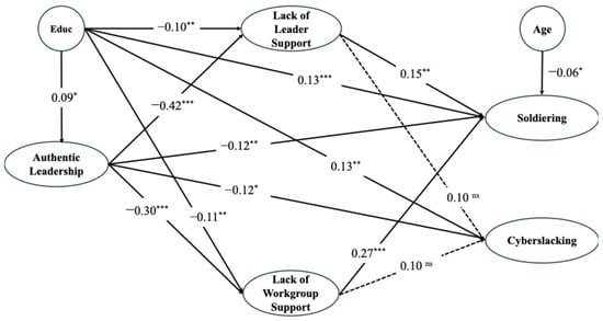 To analyze the results, we followed a two-step analysis (). First, we examined the measurement models, and second, we analyzed the structural model (validation of hypotheses). Regarding the first step, all of the factor loadings were significant. Reliability (Cronbach’s alpha and composite reliability) was satisfactory in all the scales, with values exceeding 0.70, as detailed in the Instruments Section for each construct. To assess convergent validity, the average extracted variance (AVE) was used. The AVE for each construct was acceptable, as all values were higher than 0.50, thus indicating that each construct explains at least 50% of the variance of its indicators (Table 2). With regard to discriminant validity, we followed the criterion of (); we checked that the square root of the AVE of each construct (which is indicated on the diagonal of Table 2, in bold italics) was higher than the correlations of that construct with the other study variables. Additionally, following recent recommendations in PLS-SEM analysis (), we ensured the heterotrait–monotrait ratio of correlations (HTMT) was below 0.85 (although values below 0.90 represent adequate validity, we took a more conservative approach by considering a value of 0.85, which is the recommended value when constructs are conceptually different). The higher HTMT = 0.83 corresponded to a lack of workgroup support and a lack of leader support, which are two related constructs. The other ratios were low (HTMTAL-cyberslacking = 0.19; HTMTAL-soldiering = 0.27; HTMTAL-lack of leader support = 0.49; HTMTAL-lack of workgroup support = 0.37; HTMTlack of leader support-cyberslacking = 0.23; HTMTlack of leader support-soldiering = 0.43; HTMTlack of workgroup support-cyberslacking = 0.23; HTMTlack of workgroup support-soldiering = 0.48; HTMTcyberslacking-soldiering = 0.59).