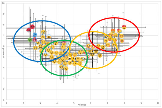 , 😍, 😘, 😚, 😝, 🥳 and 🤩. Because both average valence and arousal were greater than 7, this cluster can be interpreted as “strong positive sentiment”. In cluster 2, the following 14 emojis are classified: 😃, 😇, 😋, 😌, 😙, 😜, 😛, 😎, 🤠, 🤡, 🤔, 🤭, 😳 and 😮. Average valence was 6.12 and average arousal was 5.66. Therefore, this cluster can be interpreted as “moderately positive sentiment”. In cluster 3, the following 21 emojis are classified: 😅, 🧐, 😶, 😐, 😑, 😒, 🙄, 🤨, 😞, 😔, 😕, 🙁, 😬, 🥺, 😨, 😧, 😪, 😓, 🥴, 😲 and 😗. Average valence was 4.37 and average arousal was 4.89. Therefore, this cluster can be interpreted as “neutral sentiment”. Finally, in cluster 4, the following 19 emojis are classified: 😟, 😠, 😡, 🤬, 😣, 😖, 😫, 😩, 😤, 😱, 😰, 😢, 😥, 😭, 😵, 🤯, 🤢, 🥵 and 🥶. From the low average valence (3.12) and high average arousal (6.49), this cluster can be interpreted as “negative sentiment”.