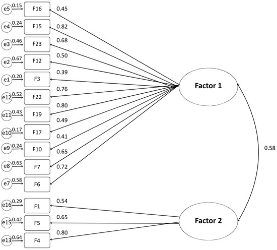 Cronbach’s alpha and CR were acceptable for both factors (Factor 1: α = 0.87, CR = 0.87; Factor 2: α = 0.70, CR = 0.71), and AVE values were 0.39 and 0.45, respectively (see Table 6). Although the AVE for Factors 1 and 2 were slightly below the recommended 0.50 threshold, their high CR indicates acceptable convergent validity in line with recommendations from recent literature (Hair et al., 2019). Figure 1 illustrates the final model.
