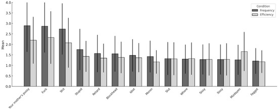 The most frequently used swear words and their perceived effectiveness were contrasted by incorporating data from the EFA and CFA participants. The findings revealed that “your mother’s pussy” (F1), “fuck” (F4), and “shit” (F5), all of which belong to the Expression of Frustration factor, were the three most reported swear words (see Figure 2). Interestingly, these terms were also rated as the most effective, indicating that the most frequently used swear words are perceived as the most effective.
