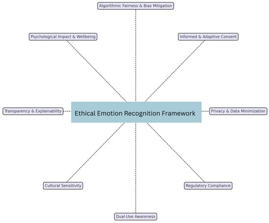 This work proposes a unified ethical framework for emotion-recognition research, involving ten key considerations across the stages of design, implementation, and deployment of emotion-recognition systems as shown in Figure 2. At the level of the individual, the framework emphasizes knowledge and participant autonomy with regard to informed consent, so that individuals know and can control the use of their emotional data. It also guarantees privacy and data security by ensuring that emotional data is protected according to the data protection laws. The consideration of the psychological effects of these technologies is also included to avoid negative emotional effects or stress that may be incurred by the users.