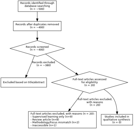 - Use of Supervised Learning Only: The majority of excluded studies (12 articles) were removed because they exclusively employed supervised learning methods, failing to meet the core inclusion criterion of utilizing unsupervised techniques.