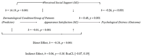 Additionally, the effect of the first mediator on the dependent variable, controlling for the independent variable (i.e., the effect of overall satisfaction with external appearance on the overall psychological distress, controlling for the group of dermatological patients—path b1), is statistically significant with b = −0.26, p < 0.001, BcaCL [−0.41, −0.11].