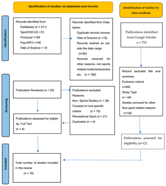 From the resulting output, sixteen studies were identified by the lead researcher reading the full text of the included studies to make sure they were relevant and appropriately addressed the research question. Initially, 411 studies were identified through the literature search on 4 databases, SportDISCUS, ProQuest, PsycINFO, and Web of Science, after reviewing and modifying the search terms to identify more focused studies. Titles and abstracts were read to assess for inclusion of the 189 studies in ProQuest; 3 studies were included. Of the studies in PsycINFO, 140 studies were identified but all were excluded as being outside the scope of this study. A complimentary search through Google Scholar highlighted 753 studies, of which 12 met the inclusion criteria. These, plus 1 study from SportDISCUS and 3 doctoral dissertations from ProQuest, comprised the 16 studies included as presented in the PRISMA flow diagram (Figure 1). To increase openness and transparency, this scoping review has been registered on the Open Science Framework (OSF) https://doi.org/10.17605/OSF.IO/4AJZ7.