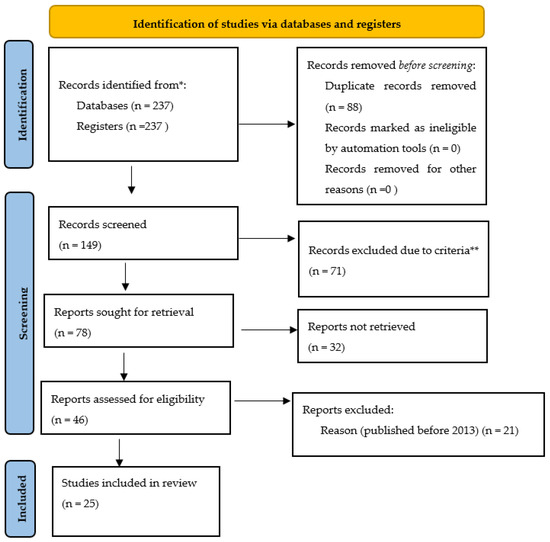 - Page, M. J., McKenzie, J. E., Bossuyt, P. M., Boutron, I., Hoffmann, T. C., Mulrow, C. D., Shamseer, L., Tetzlaff, J. M., Akl, E. A., Brennan, S. E., Chou, R., Glanville, J., Grimshaw, J. M., Hróbjartsson, A., Lalu, M. M., Li, T., Loder, E. W., Mayo-Wilson, E., McDonald, S., … Moher, D. (2021). The PRISMA 2020 statement: An updated guideline for reporting systematic reviews. BMJ, 372, n71. [Google Scholar] [CrossRef]