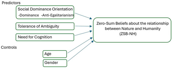 Path model of the cross-sectional study design. Tolerance of Ambiguity, Need for Cognition, and Social Dominance Orientation (SDO) were specified as predictors of zero-sum beliefs about the human–nature relationship (ZSB-NH). Age and gender were included as control variables.
